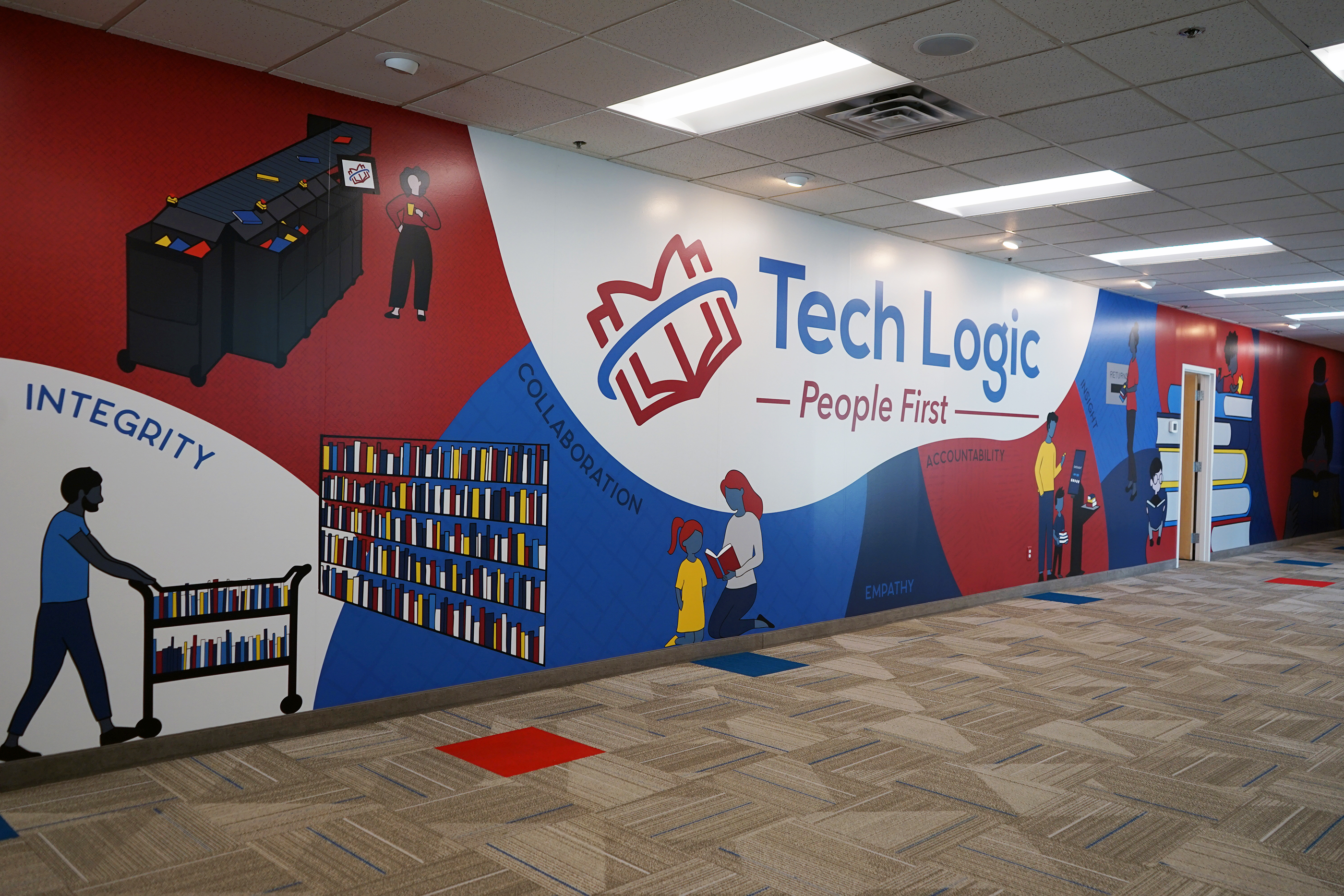Part of the new renovation is a colorful wall mural at the entrance to the office that includes the company's core values: Integrity, Collaboration, Empathy, Accountability, and Insight.